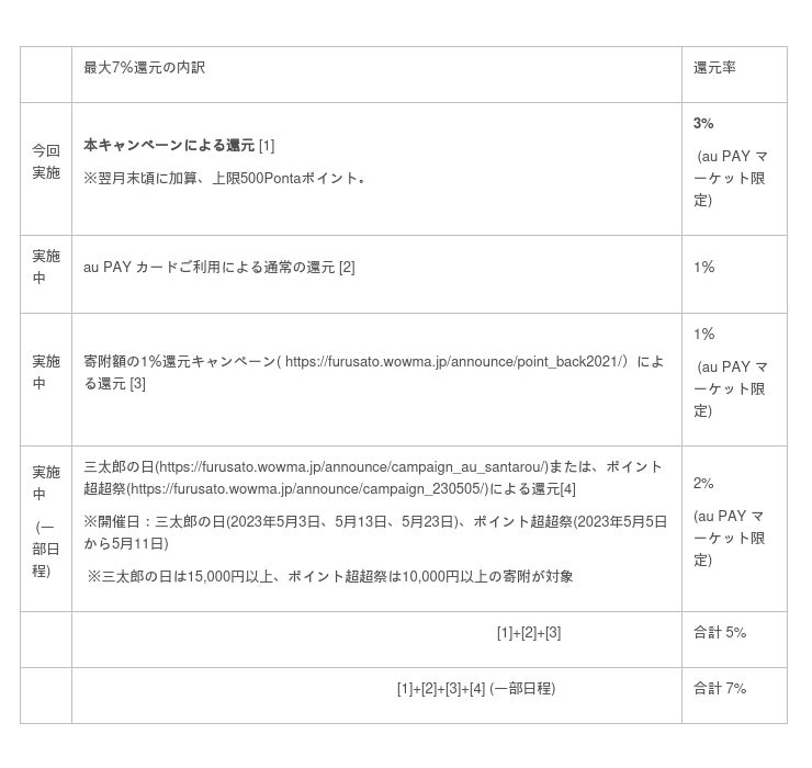 条件などの詳細やエントリーはこちら(https://furusato.wowma.jp/announce/campaign_aupaycard_230501/)をご参照ください。