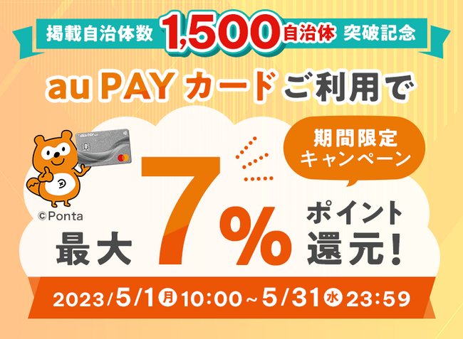 1,500自治体突破を記念して、2023年5月1日から2023年5月31日までの期間中、au PAY カード利用の寄附などで合計最大7%のポイントを還元します。