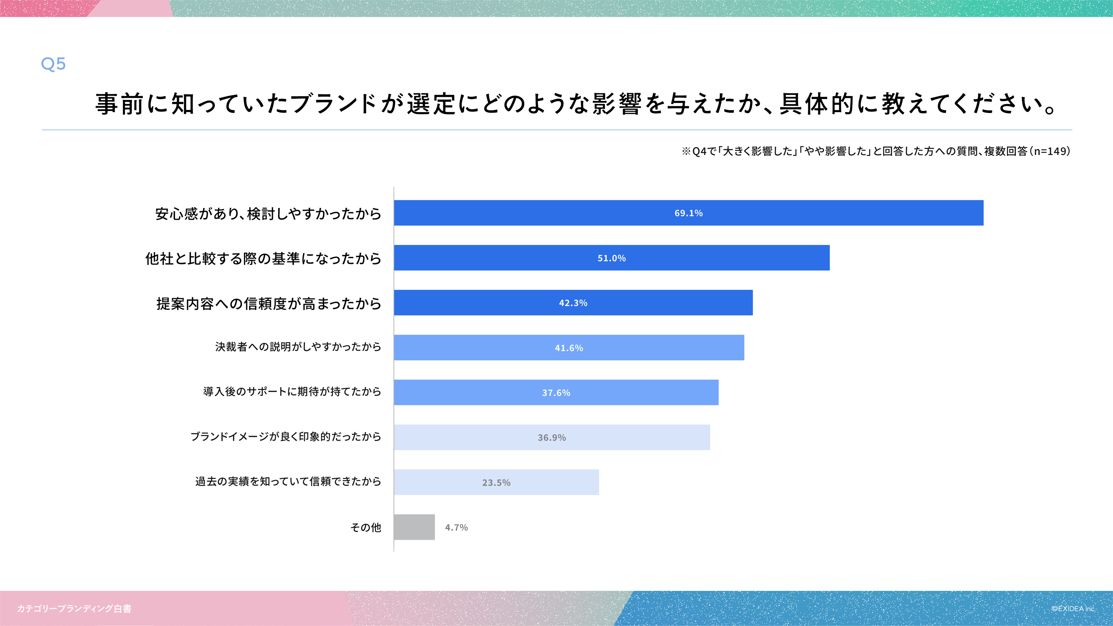 「Q5. Q4で「大きく影響した」「やや影響した」と回答した方にお聞きします。事前に知っていたブランドが選定にどのような影響を与えたか、具体的に教えてください。(複数回答)」(n=149)と質問したところ、「安心感があり、検討しやすかったから」が69.1%、「他社と比較する際の基準になったから」が51.0%、「提案内容への信頼度が高まったから」が42.3%という回答となりました。[画像7: https://prcdn.freetls.fastly.net/release_image/41581/189/41581-189-55433983b21c2d106d87a55e6f2f02c0-3900x2194.png?width=536&quality=85%2C75&format=jpeg&auto=webp&fit=bounds&bg-color=fff ]