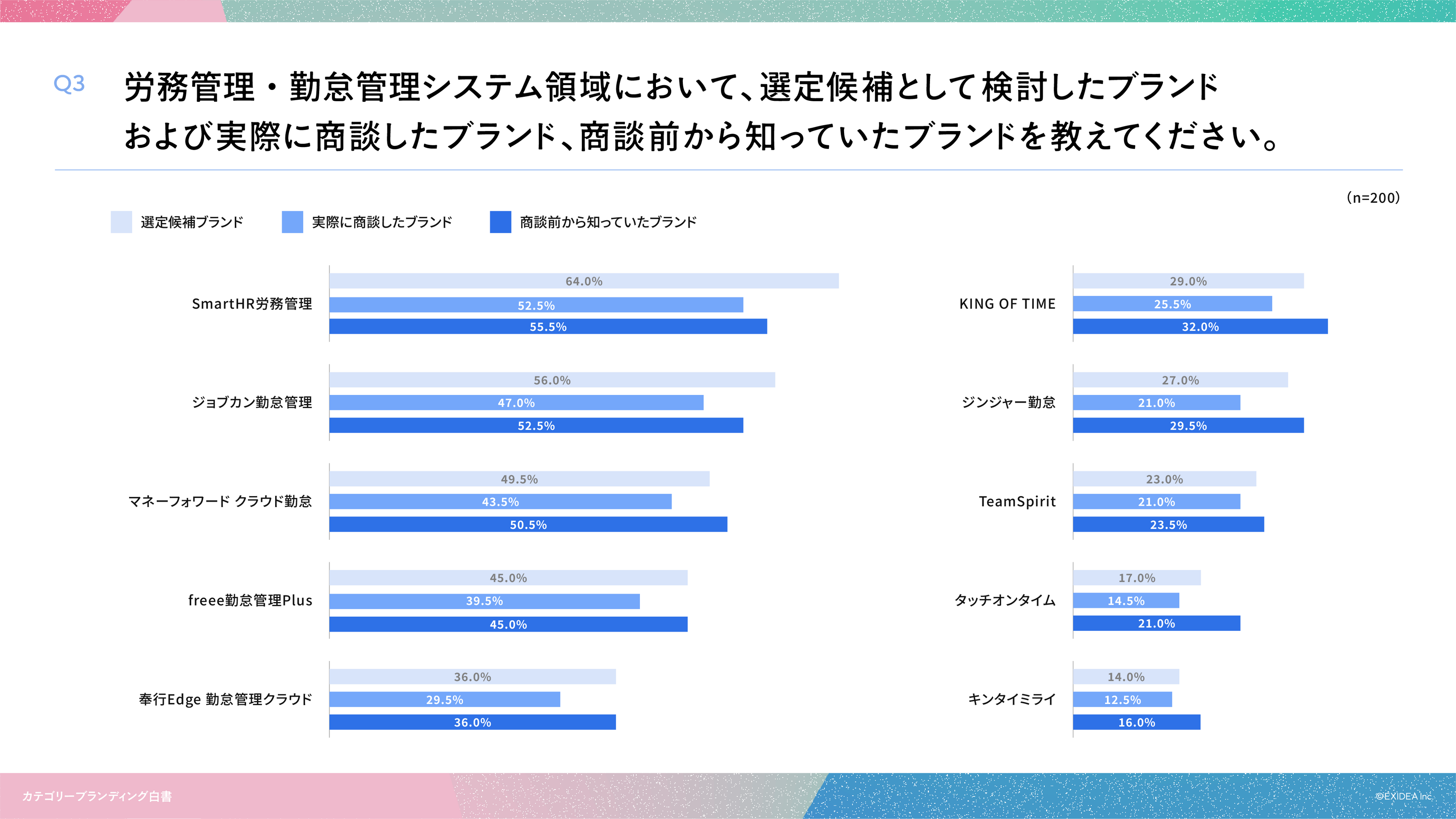 「Q3. 労務管理・勤怠管理システム領域において、選定候補として検討したブランドおよび実際に商談したブランド、商談前から知っていたブランドを教えてください。」(n=200)と質問したところ、選定候補ブランドは「SmartHR労務管理」が64.0%、実際に商談したブランドは「SmartHR労務管理」が52.5%、商談前から知っていたブランドは「SmartHR労務管理」が55.5%という回答となりました。[画像5: https://prcdn.freetls.fastly.net/release_image/41581/189/41581-189-62191c3b9fdba88a94c0521459403af7-3900x2194.png?width=536&quality=85%2C75&format=jpeg&auto=webp&fit=bounds&bg-color=fff ]