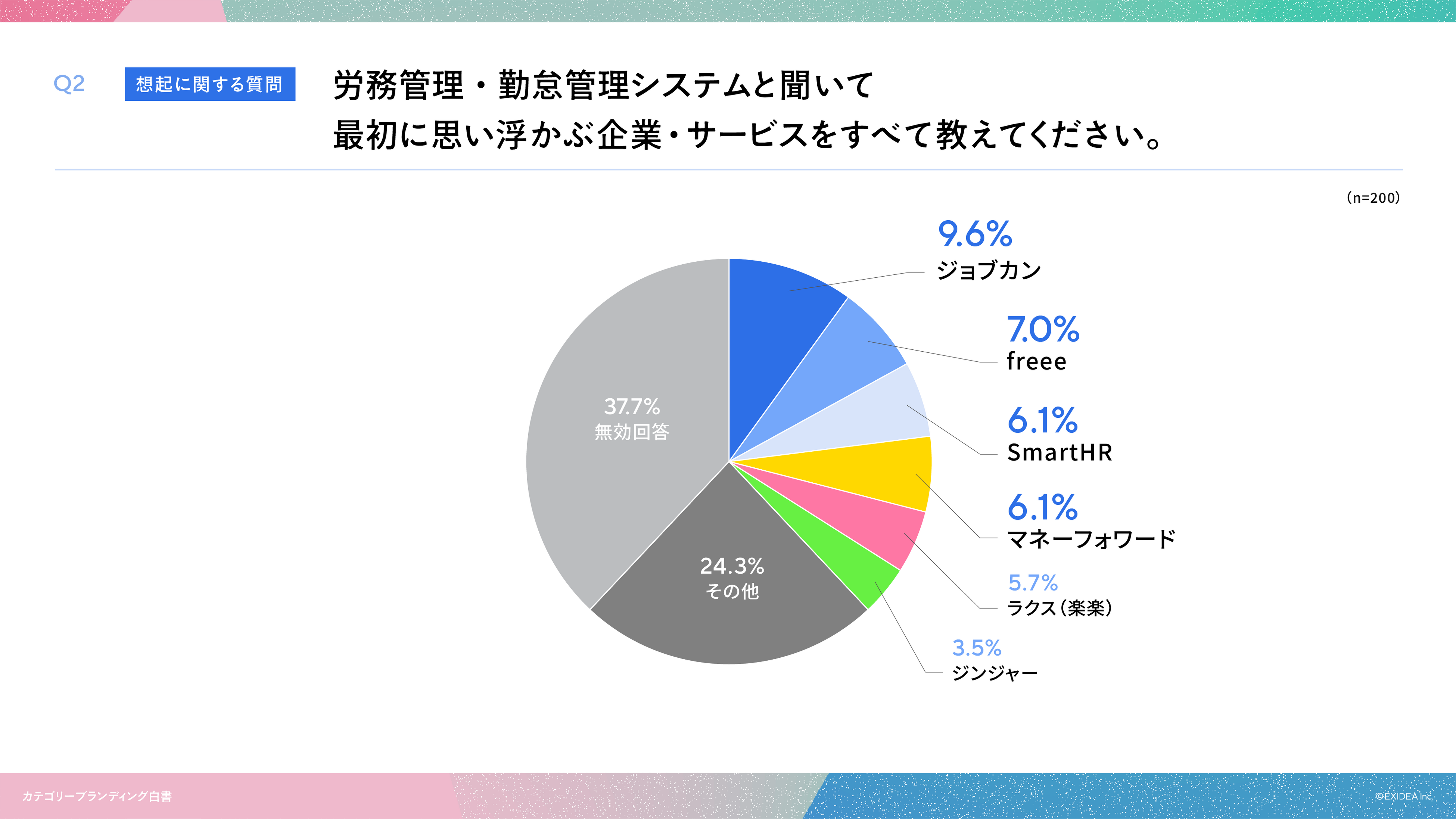 「Q2. 労務管理・勤怠管理システムと聞いて最初に思い浮かぶ企業・サービスをすべて教えてください。(自由回答)」(n=200)と質問したところ、「ジョブカン」が9.6%、「freee」が7.0%という回答となりました。[画像4: https://prcdn.freetls.fastly.net/release_image/41581/189/41581-189-a5cb3f30c8a7a045b3ed88cdbf306055-3900x2194.png?width=536&quality=85%2C75&format=jpeg&auto=webp&fit=bounds&bg-color=fff ]