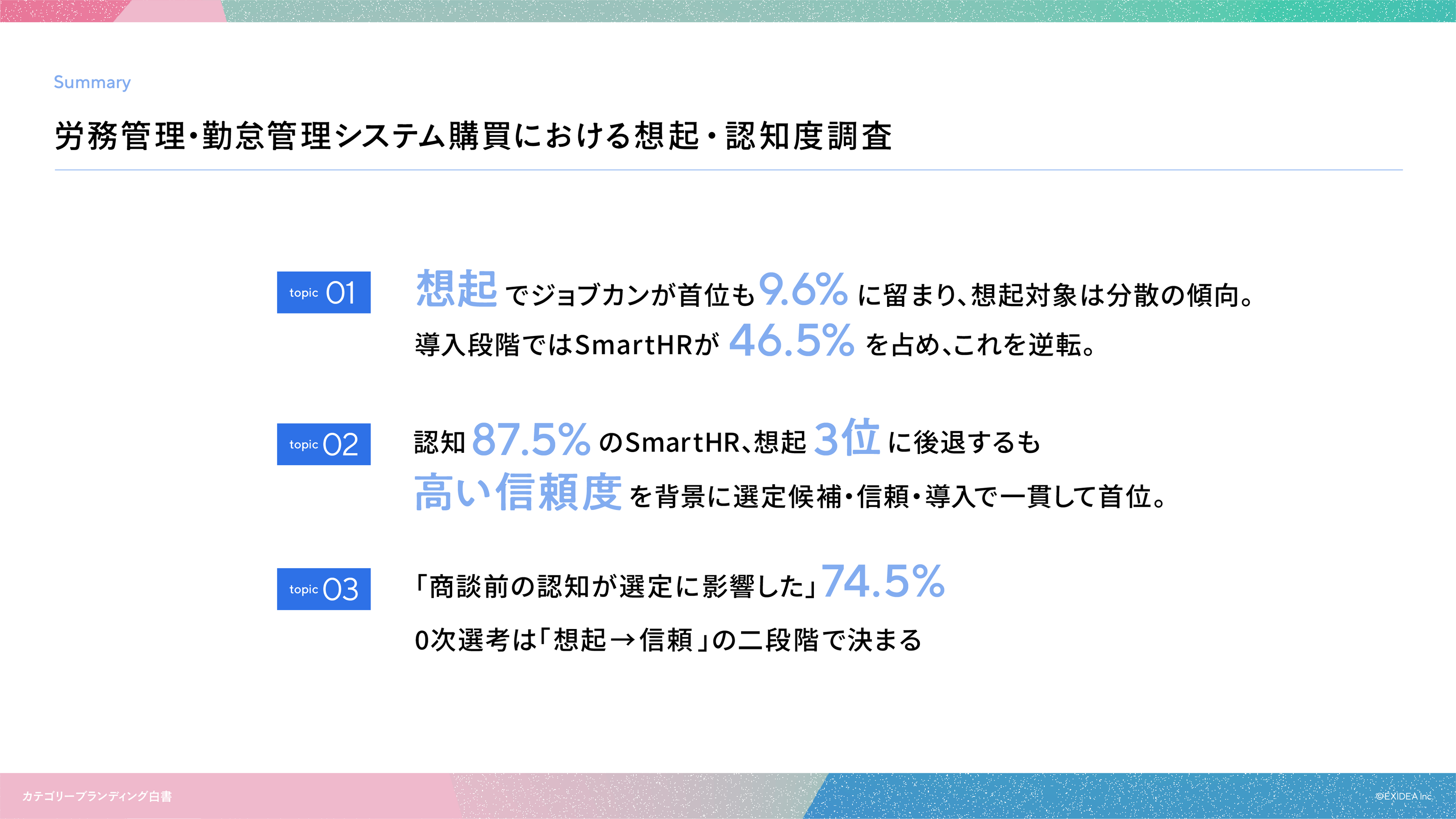 【カテゴリーブランディング白書 vol.9】いかに「カテゴリーの定義」を握るか。労務管理・勤怠管理システム領域ではジョブカンが想起首位となるも、SmartHRが企業認知・信頼で押し切る結果に。