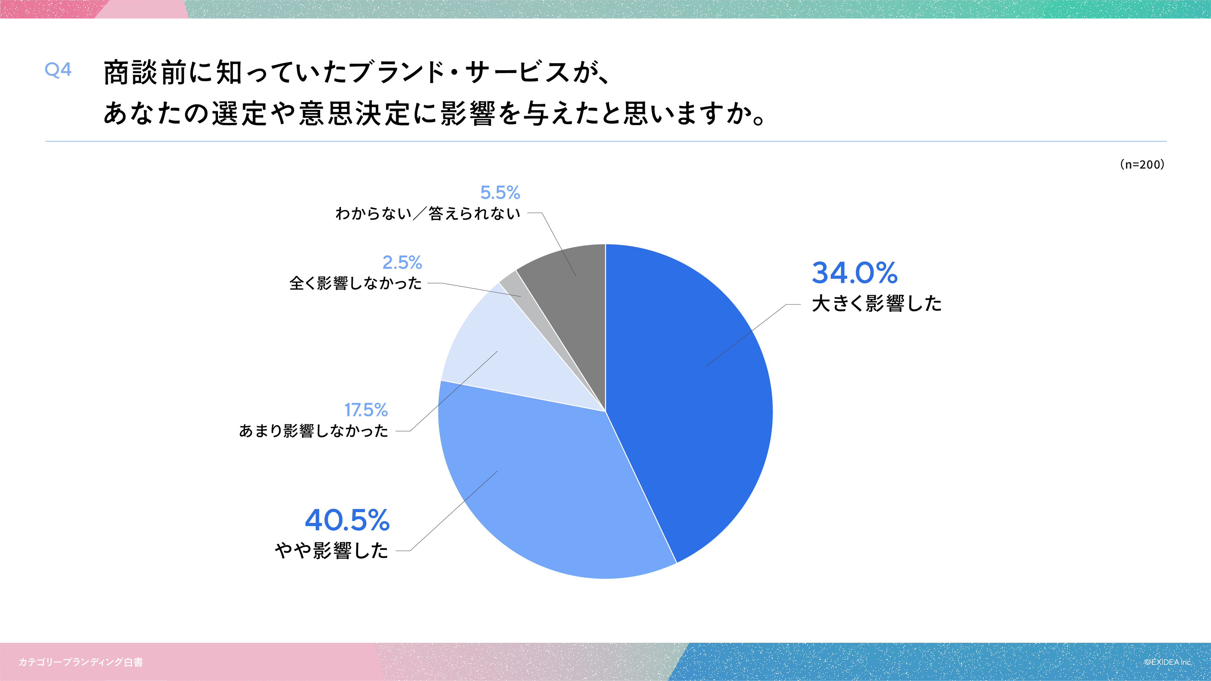 「Q4. 商談前に知っていたブランド・サービスが、あなたの選定や意思決定に影響を与えたと思いますか。」(n=200)と質問したところ、「大きく影響した」が34.0%、「やや影響した」が40.5%という回答となりました。[画像6: https://prcdn.freetls.fastly.net/release_image/41581/189/41581-189-ff50aa04a2f192f1e2e83f835b1fec49-3900x2194.png?width=536&quality=85%2C75&format=jpeg&auto=webp&fit=bounds&bg-color=fff ]