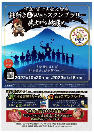 静岡県は、大河ドラマ「鎌倉殿の13人」ゆかりの地 伊豆・富士山周遊促進連絡協議会と連携し、Webスタンプラリーに謎解きの要素を加え、史跡・観光施設等を巡る「伊豆・富士山歴史絵巻 謎解き&Webスタンプラリー ”武士からの挑戦状”」を10月20日から実施しています。