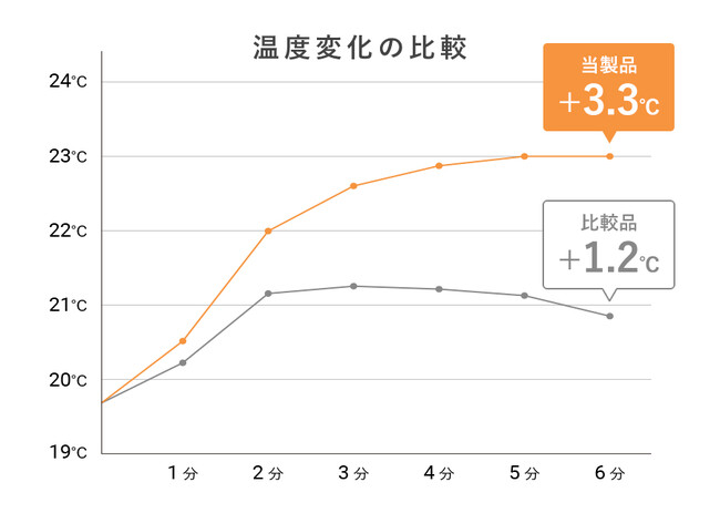 温度変化の比較グラフにあるように、一般的な毛布はポリエステルのみで作られているのに対し、吸湿発熱する複数の繊維を採用。保温性が優れているという試験結果があります。