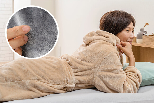 吸湿発熱素材を採用し、サッと羽織るだけですぐ温かい「着る毛布」。 着たまま作業が快適にできるよう着丈アレンジも可能。