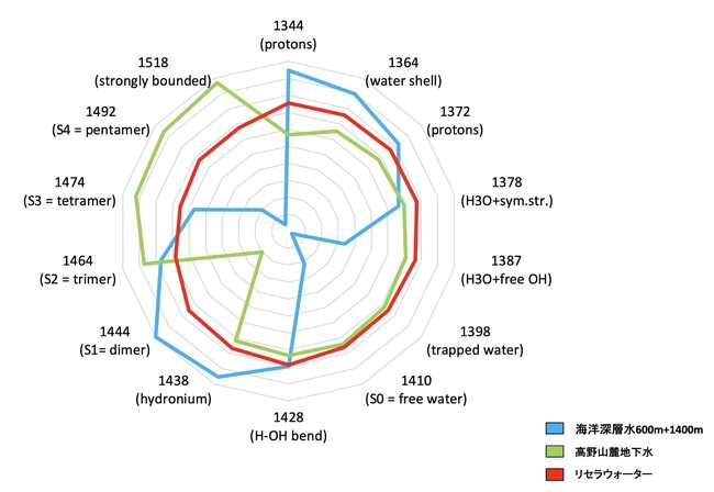 アクアグラム(R)とは、水の吸光スペクトルデータ分析により検出される、様々な種類の水分子構造に、密接に関係する水のスペクトルパターンに基づいて、水の機能性を表したグラフです。