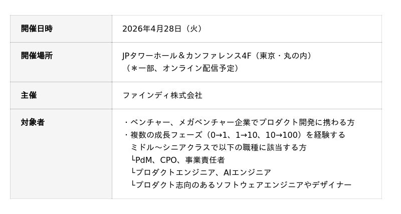 エンジニアプラットフォームを提供するファインディ株式会社(東京都品川区、代表取締役:山田 裕一朗、以下「当社」)は、本日より「Product Management Summit」のスポンサー募集を開始することを発表します。本サミットは、AI時代の顧客価値を生み続けるプロダクトマネジメントを共有する場として、2026年4月28日(火)にオンライン・オフラインのハイブリッドにて開催します。