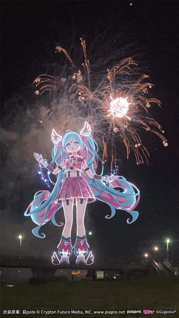 スマホアプリ「HoloModels」に対応し、音楽花火に合わせて初音ミクのAR特別コンテンツが出現。