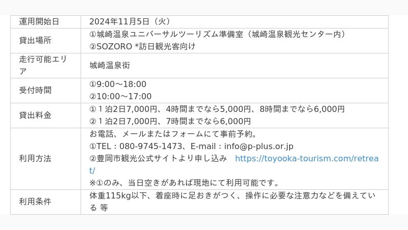 両者は今後、城崎温泉街に関わるさまざまなステークホルダーなどとも密に連携しながら、アクセシビリティ環境整備をより一層進めていくとともに、あらゆる人がいつでもどこでも安心快適に近距離移動できるインクルーシブな社会の実現を目指してまいります。