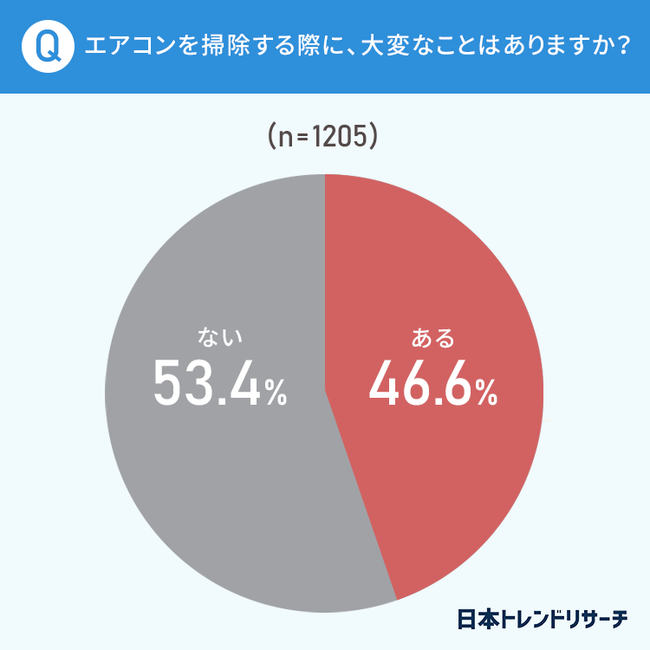 46.6%が、エアコンを掃除する際に「大変なことがある」と回答しました。