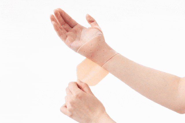 サポーターの穴部分に親指を入れ、手のひら側に回し手首まわりでピタッと止めます。