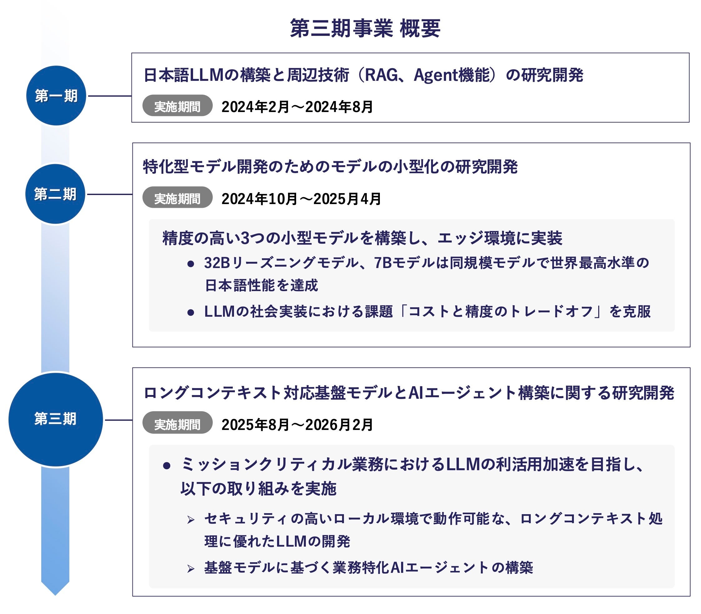 第三期事業におけるABEJAの成果は、以下の通りです。(1)ミッションクリティカル業務に利活用できる小型化LLMとAIエージェントの構築
