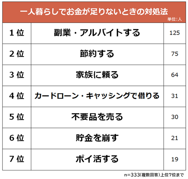 一人暮らしをしていてお金が足りないときの対処法1位は「副業・アルバイトをする」