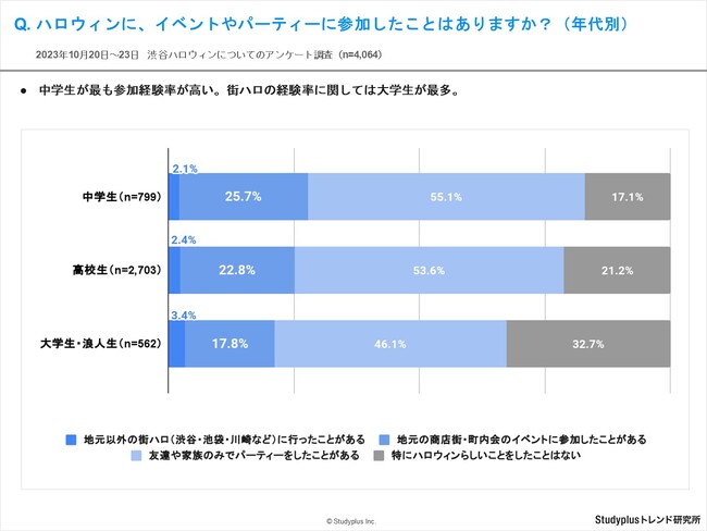 ・中学生が最も参加経験率が高い。街ハロの経験率に関しては大学生が最多。