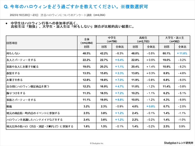 ・中学生はハロウィン行事への参加率が高く、高校生は「勉強」、大学生・浪人生は「何もしない」割合が比較的高い結果に。