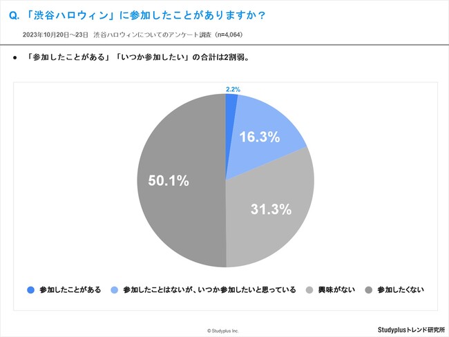 スタディプラス株式会社(本社:東京都千代田区、代表取締役:廣瀬高志、以下スタディプラス)のStudyplusトレンド研究所は、2023年10月20日(金)から10月23日(月)にかけて学習管理アプリ「Studyplus」上で全国の中学生・高校生・浪人生・大学生を対象に「渋谷ハロウィンについてのアンケート調査」を実施、4,064名から回答を得ましたのでご報告いたします。