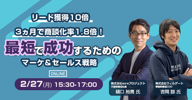 株式会社ウィルゲート(本社:東京都港区、代表取締役:小島 梨揮)は、株式会社soraプロジェクト(本社:福岡県筑紫野市、代表取締役社長:樋口 裕貴)と合同で、『リード獲得10倍・3ヵ月で商談化率1.8倍!最短で成功するためのマーケ&セールス戦略』をテーマにしたオンラインセミナーを2月27日(月)に開催いたします。(申し込み先: https://sora1.jp/news/0227_webinar/ )