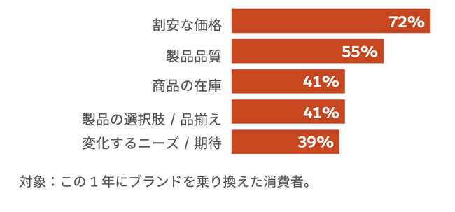 日本でブランドを乗り換える理由のトップ3は、割安な価格、製品品質、製品の選択肢 / 品揃え、でした。