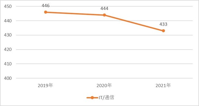 「IT/通信」業界の2019年からの平均年収の推移を見ると、2019年は446万円、2020年は444万円、2021年は433万円と、全体的に減少傾向という結果になりました。