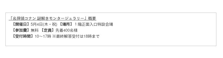 江戸川コナンとの撮影会も実施します 1.12時〜、2.13時30分〜、3.15時〜(各回約30分) ・定員各回先着30名様 ・参加費無料 ※カメラの用意及び撮影はお客様ご自身でお願いいたします ※撮影はお一人様1回限りです