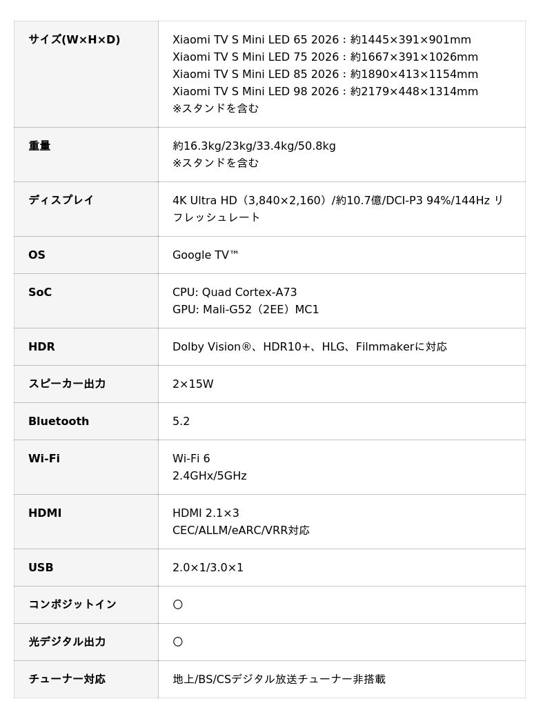 小米技術日本株式会社(以下「シャオミ・ジャパン」、本社:東京都港区)は、Mini LED テクノロジーを採用した最新のチューナーレススマートテレビ「Xiaomi TV S Mini LED 2026 シリーズ」の4モデル(65 / 75 / 85 / 98インチ)を、2026年3月24日(火)より発売開始します。本シリーズは、従来のラインナップからさらなる大型化を遂げ、新たに85インチおよび98インチの超大画面モデルを追加。最新の「Google TV」によるシームレスなデバイス連携と、最大288Hzの高速駆動を実現するゲーミング性能を備え、ホームエンターテインメントの基準を塗り替えます。