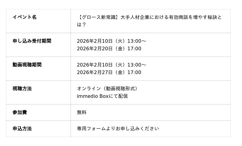 株式会社immedio(本社:東京都、代表取締役:浜田英揮)は、パーソルテンプスタッフ株式会社をゲストに迎え、「大手人材企業における有効商談を増やす実践プロセス」をテーマとしたオンラインウェビナーを2026年2月に開催いたします。