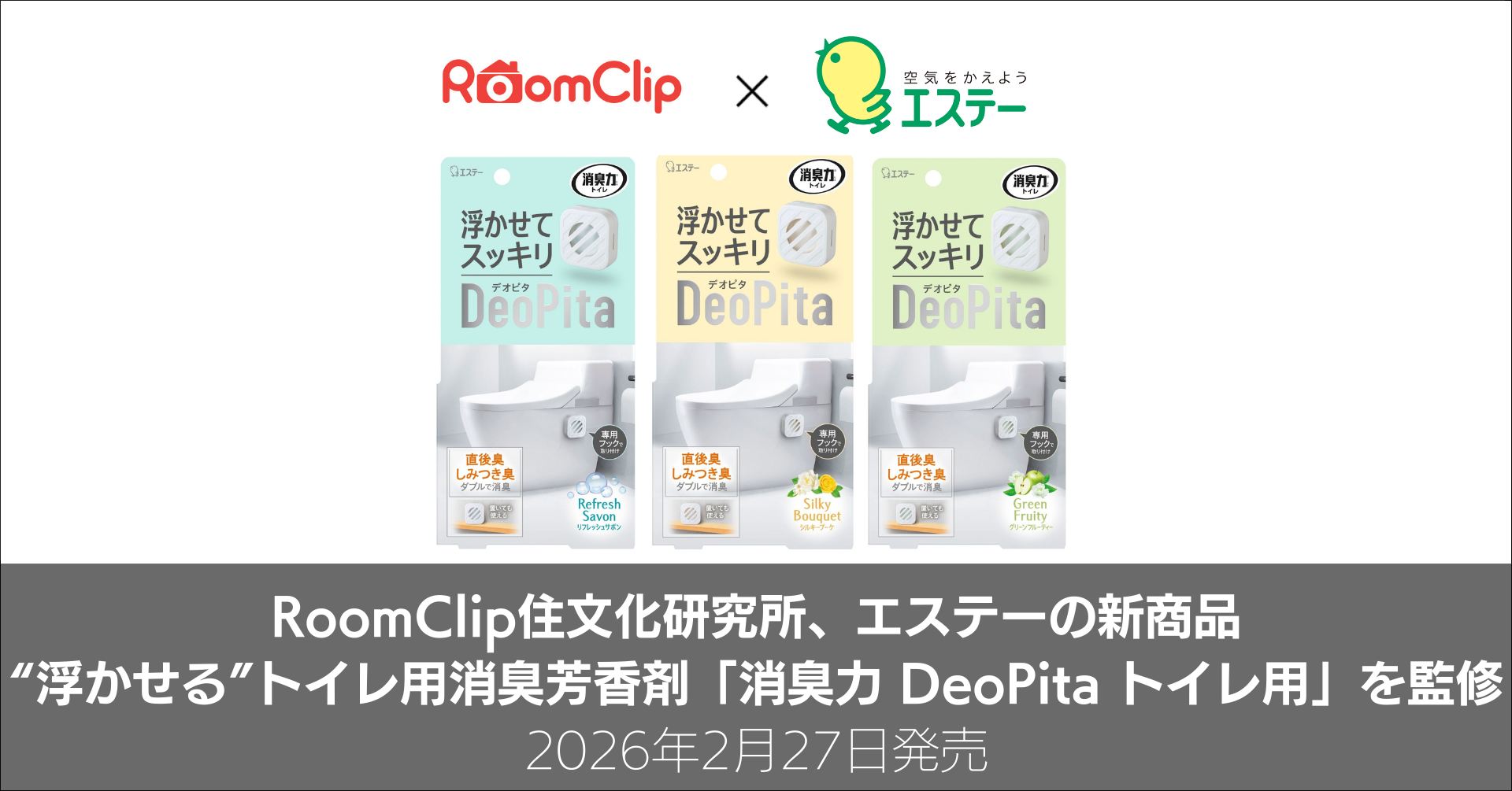 ルームクリップ株式会社(本社:東京都渋谷区、代表取締役社長:高重正彦、以下ルームクリップ)が運営する「RoomClip住文化研究所」は、エステー株式会社(本社:東京都新宿区、代表執行役社長:上月洋、以下 エステー)が2026年2月27日より発売開始する“浮かせる”トイレ用消臭芳香剤「消臭力 DeoPita トイレ用」の監修を行いました。本取り組みにおいて、RoomClip住文化研究所は、600万枚以上の膨大な投稿データからトイレ空間のトレンドを分析。生活者の潜在ニーズをデータで裏付け、コンセプト立案のための支援を全面的に行いました。ルームクリップは「人と人、人と企業が繋がる住生活の新しい産業と文化を築く」というビジョンの実現に向け、RoomClipに蓄積したデータや生活者のインサイトを活用した、住生活領域の企業様の商品開発やマーケティング支援を幅広く行なって参ります。