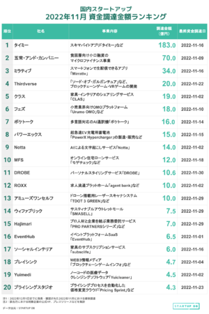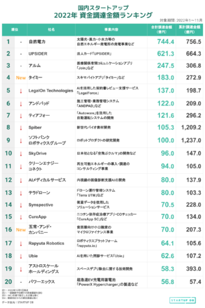 【STARTUP DB】調査結果 国内スタートアップ資金調達金額ランキング(2022年1月-11月)
