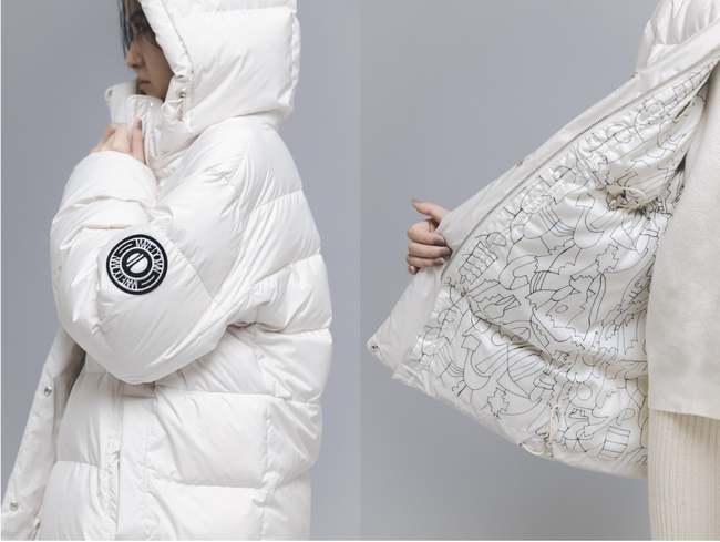 「つくる」から「つかう」まで、「しあわせ」を追求し、着るエシカルとして100%国産の素材にこだわった「IWATEDOWN」は、「岩手がも」の羽毛を使用した軽い着心地と上質な素材が特徴のダウンジャケットです。「岩手がも」は岩手県田野畑村の雄大な自然環境の中で飼育されています。岩手県にはダウンの縫製工場が多いという地域性があり、実は一般流通している国産ダウンの縫製は岩手県内で行われているものが多いという特徴があります。岩手の大自然と職人の技を掛け合わせ、100年先まで長く使っていただける1着を目指して生み出されました。裏地にはヘラルボニーの契約アーティスト小林覚と工藤みどりの2名のアートを起用。日常のなかにアートが自然と溶け込むように、普段使いのコーディネートにも使いやすいモノトーンの作品を生地に載せています。