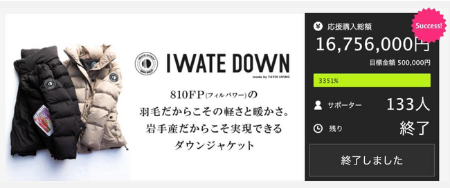 IWATEDOWN第一弾となるダウンジャケットはマクアケのクラウドファンディングで予約販売を行い、255着すべてが完売いたしました。当初の目標金額が50万円だったのに対し、終了時には1600万円を越え、133人のサポーターが集まりました。