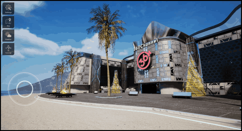 建物の周囲にはデザインがないアセットでしたが、新たに砂浜、海、山並みを追加し屋外エリアでも展示やイベントができるようにリデザインしました。また、空間に最初に入った時に大きく企業ロゴが見えるように配置し、それぞれのクライアント様のオリジナル空間であることをしっかりとアピールすることが可能です。また、朝、夕、夜と経時的なリアルタイムライティングによって印象の異なる雰囲気を演出できます。