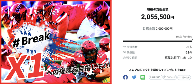 スポチュニティ株式会社(東京都 中央区、以下スポチュニティ)を利用した、アメリカンフットボールチームのBullsフットボールクラブによるクラウドファンディングプロジェクト「X1への復帰を目指して!! #Break」は目標金額200万円を達成しました。