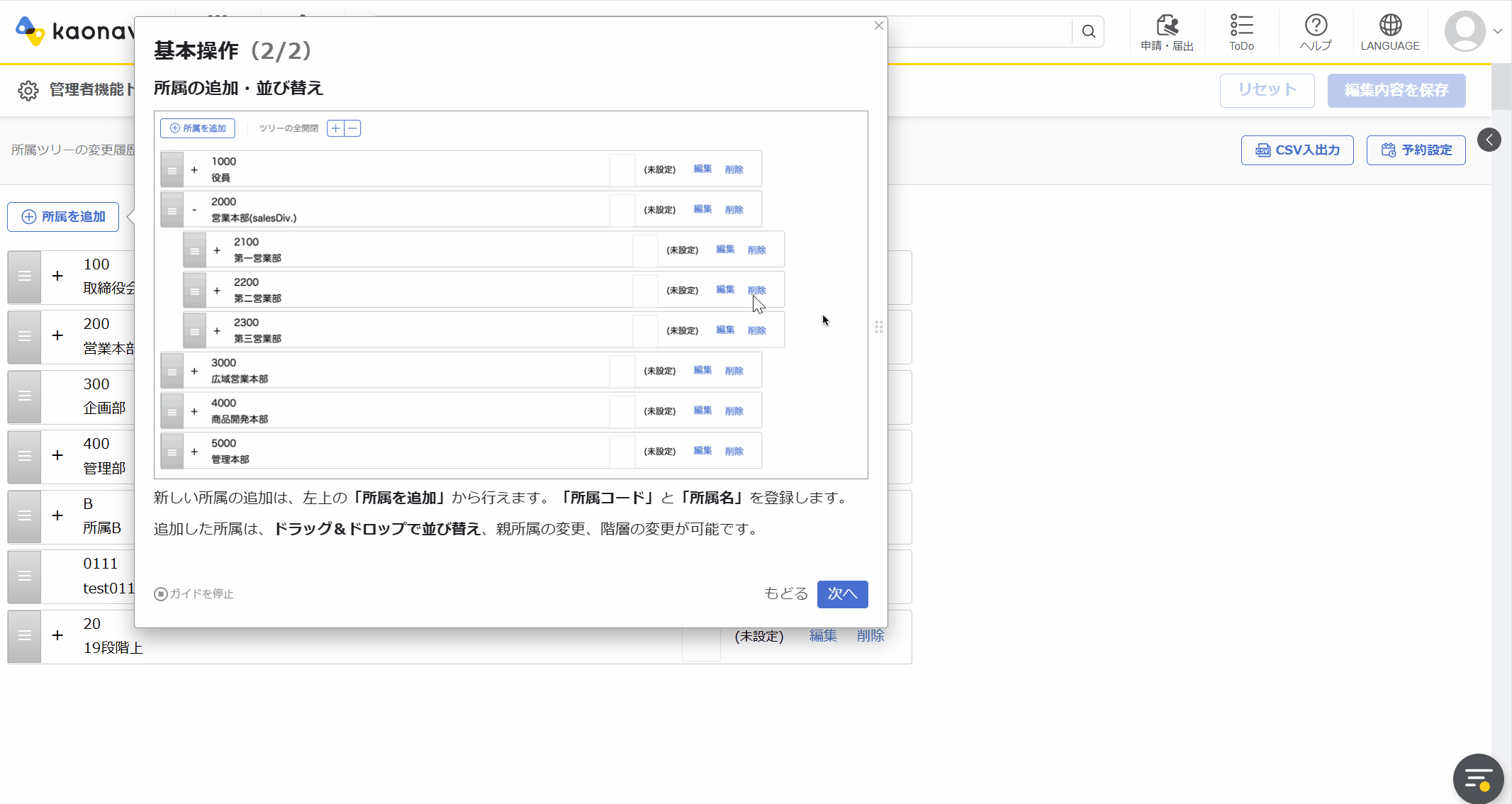 当社が提供する「テックタッチ」は、Webシステムの画面上でナビゲーションを作成・表示することができます。ナビゲーションで「カオナビ」の便利な使い方や、有用な機能を直接ユーザーに案内することが可能です。