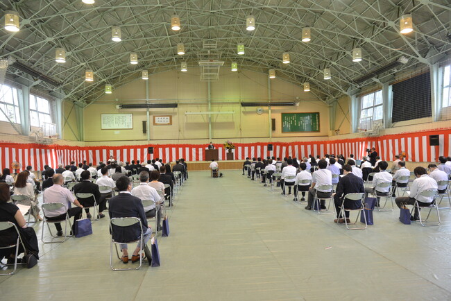 式典では冒頭に圓山校長からの挨拶、続いて深堀 直人氏から祝辞が述べられました。その後、圓山校長より混住型国際寮の利活用を通してグローバルエンジニアの育成を目指す新しい取組の紹介等がなされたほか、長谷川章教務主事から八戸高専が全高専に先駆けて取り組む「国際的エンジニア育成特別選抜入試」やSTEAM教育についての説明、松本克才寮務主事からは寮生の自主・自立性を促す新しい運営方針等が紹介されました。