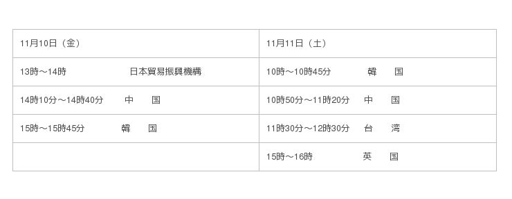 日時:11月10日(金)午後(それぞれ30分〜1時間) 中国、韓国、JETRO(日本貿易振興機構)