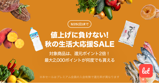 株式会社レット(本社:東京都港区、代表:佐藤 航陽)が運営する、食品ロス/在庫ロス削減のマーケット「Let(レット)」内で「値上げに負けない!秋の生活大応援SALE」を9月22日(木) 18:00より開催します。期間中、プレミアム会員様限定で対象の食品をご購入いただくと、2,000ポイントを上限に還元ポイントが2倍になります。期間中のご購入であれば、ポイント還元はお一人様あたり何度でもご利用いただけます。
