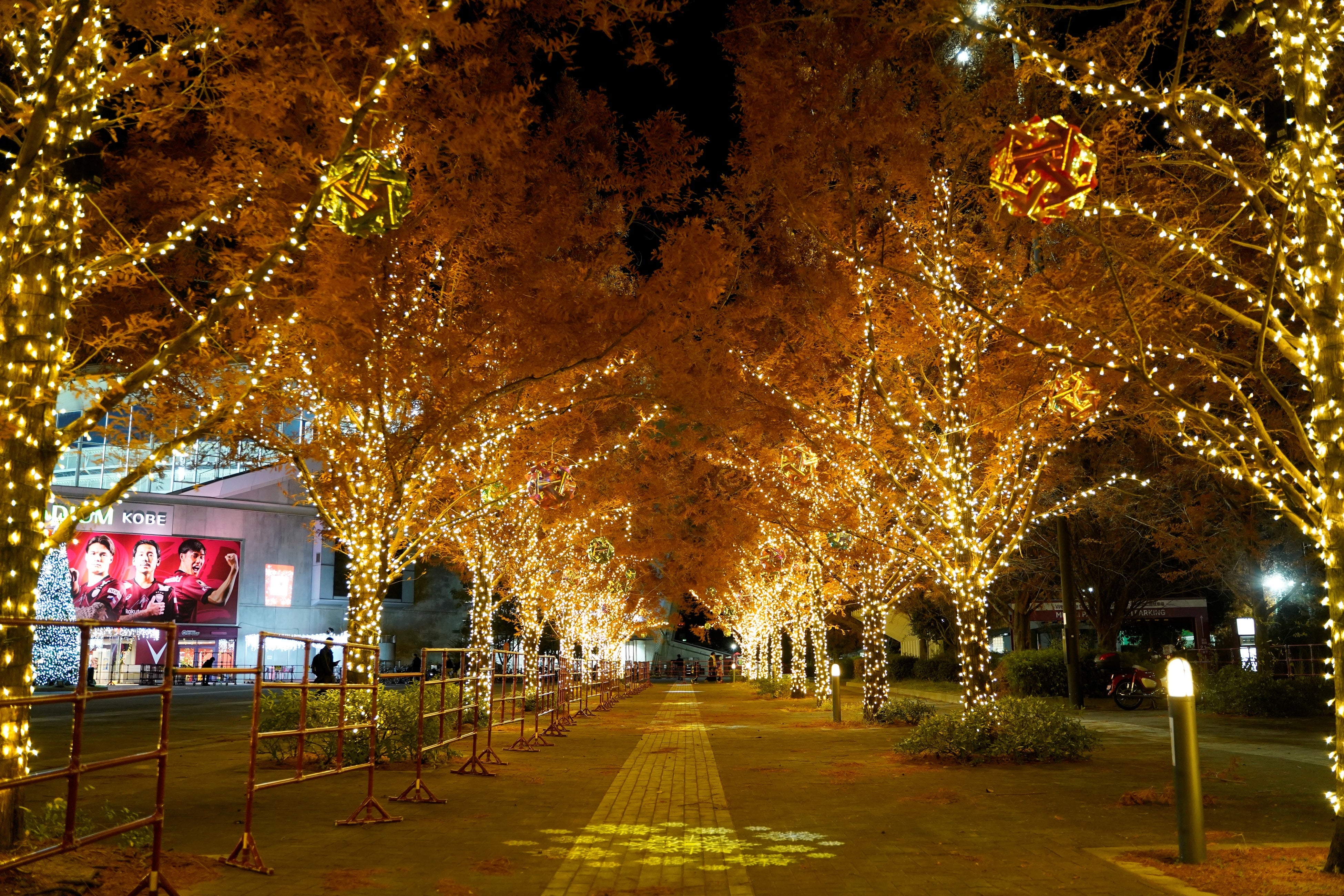 合計7万個のLEDを使用したイルミネーションが、ノエビアスタジアム神戸正面広場を鮮やかに照らし、クリスマスムードを演出します。入口からスタジアムに続く並木道とスタジアム正面の選手看板サイドに、ヴィッセル神戸30周年ロゴがライトアップで映し出される今年だけの特別な演出が見どころです。期間:2025年12月12日(金)〜12月25日(木)