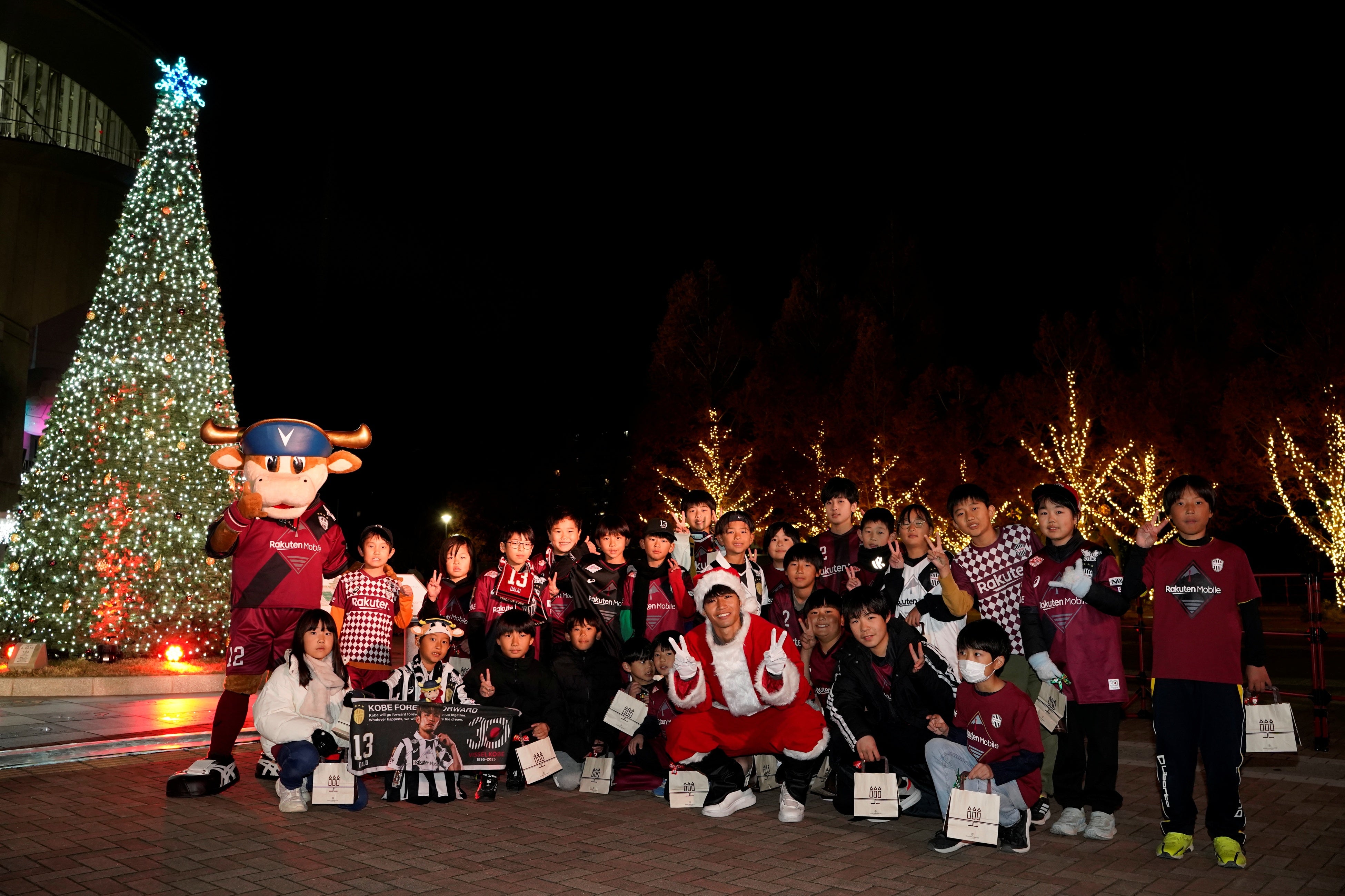 初日となる12月12日(金)には、ヴィッセル神戸の生え抜き選手である佐々木大樹選手とマスコットキャラクター モーヴィが登場し、7万個のLEDを使用したイルミネーションの点灯式を開催しました。点灯式には、ヴィッセル神戸ファンクラブ・キッズクルー(U-12)から30名の子ども達も参加し、佐々木サンタとの交流を楽しみました。