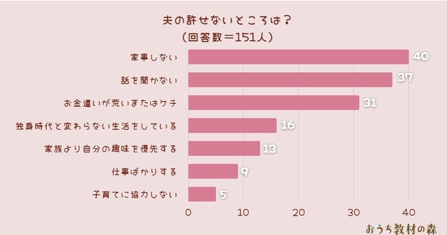 ARINA株式会社が運営する幼児、小学生の親御さん向けの教育メディア「おうち教材の森」(https://naki-blog.com/study/)は、日本全国の中学生以下のお子さんをお持ちの親御さんを対象に「夫の許せないところは?」とアンケート調査を実施しました。その結果を公表します。