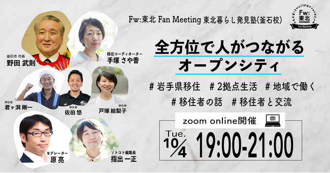 エイチタス株式会社(本社:東京都品川区、代表取締役:原 亮/小澤 剛)は、復興庁主催のワークショップ「Fw:東北(フォワードとうほく) Fan Meeting」にて、「東北暮らし発見塾(釜石校)〜全方位で人がつながるオープンシティ」の企画運営を行い、10月4日夜に無料のZoomミーティングを開催します。