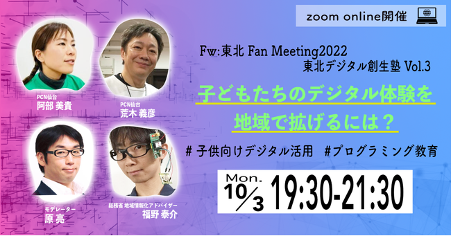 エイチタス株式会社(本社:東京都品川区、代表取締役:原 亮/小澤 剛)は、復興庁主催のワークショップ「Fw:東北(フォワードとうほく) Fan Meeting 2022」にて、「東北デジタル創生塾Vol.3 子どもたちのデジタル体験を地域で拡げるには?」の企画運営を行い、10月3日夜に無料のZoomミーティングを開催します。