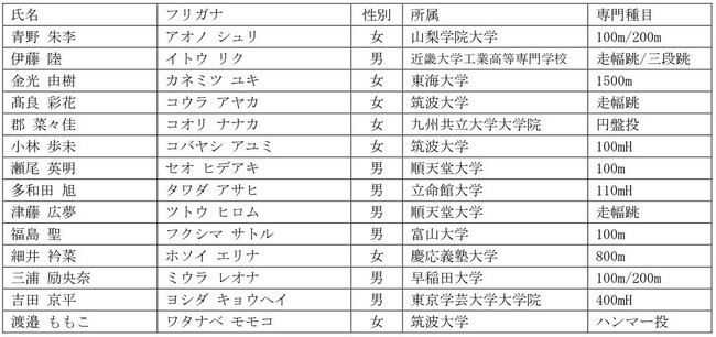 このプログラムを通じ、トップアスリートとしての競技力向上はもちろんのこと、競技以外のステージでも活躍する人材を輩出し、陸上から生まれるリーダーの方々が、これからのスポーツ界や社会をより輝くものにしていただくことを目指しており、この目的に対し賛同し、強い参加意欲のある競技者を募集いたします。