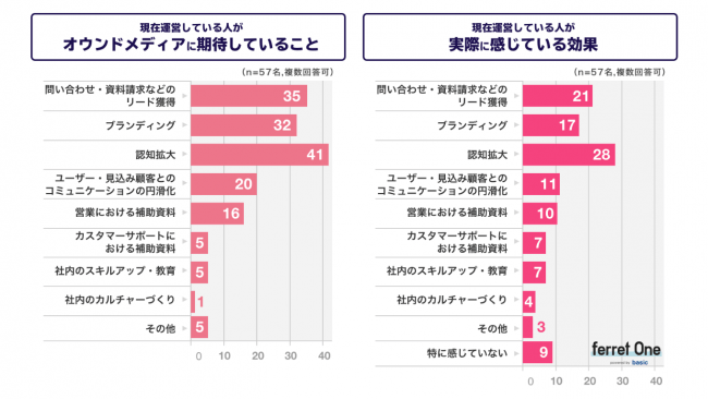 一方で、現在オウンドメディアを運営している担当者57名に「オウンドメディアに期待していた効果・実際に感じている効果」を聞いたところ、「問い合わせ・資料請求などのリード獲得」「ブランディング」「認知拡大」は期待しているよりも実感している効果としては低いものの「カスタマーサポートにおける補助資料」「社内のスキルアップ・教育」「社内のカルチャーづくり」としては期待以上の効果を得ていると回答しました。