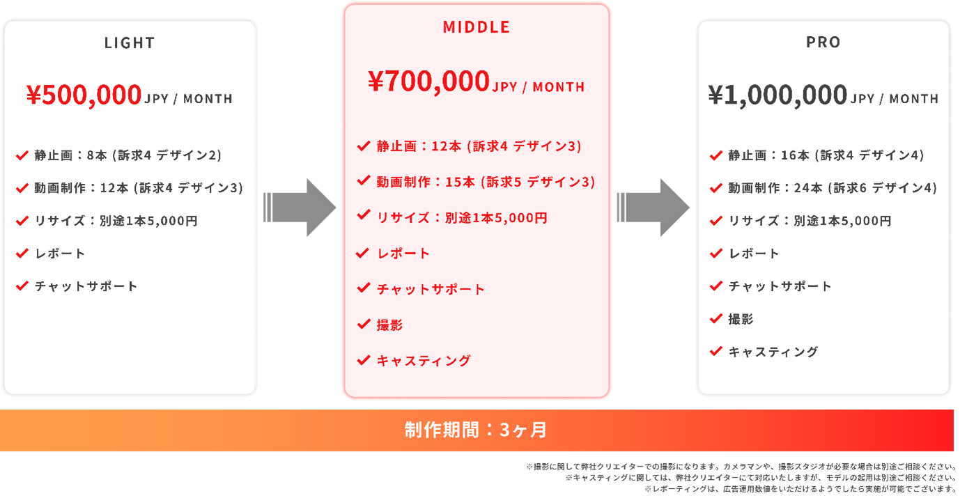 本サービスは、Meta・Google・TikTok等の運用型広告において、改善サイクルを前に進めるため、動画(縦型含む)を中心に静止画も含めたクリエイティブ制作リソースを、定額で提供します。制作物の種類やご希望の運用体制に応じて、以下のプランをご用意しています。
