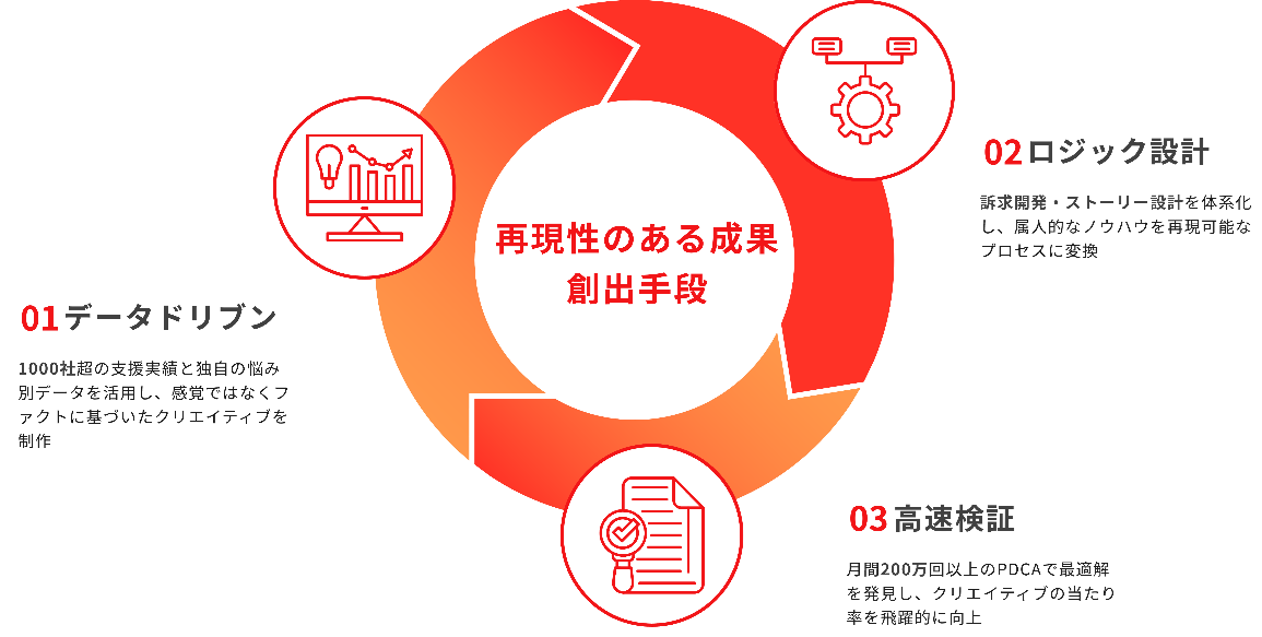 ■サービスの特長:人に依存しない、再現性のあるクリエイティブPDCAを実装