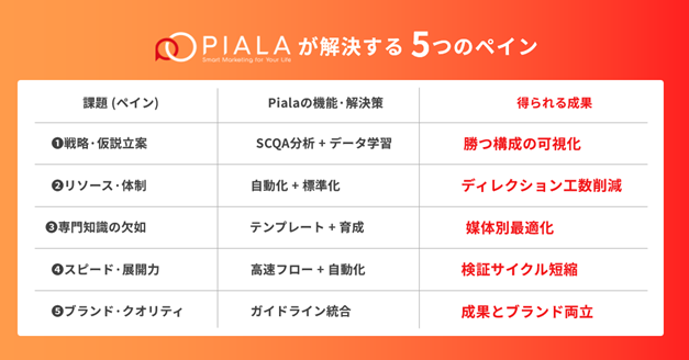 認知からユーザー獲得、ファン化までフルファネルでダイレクトマーケティングを行う株式会社ピアラ(本社:東京都渋谷区、代表:飛鳥貴雄、以下「当社」)は、広告運用をインハウス化する企業を対象に、運用型広告におけるクリエイティブの「制作→検証→改善」を前提とした定額制クリエイティブ制作支援サービスの提供を開始しました。