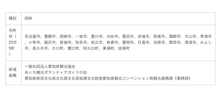 構成員:参画市町の観光所管部局長、愛知県県民文化局文化財室長、一般社団法人愛知県観光協会専務理事、あいち観光ボランティアガイドの会会長