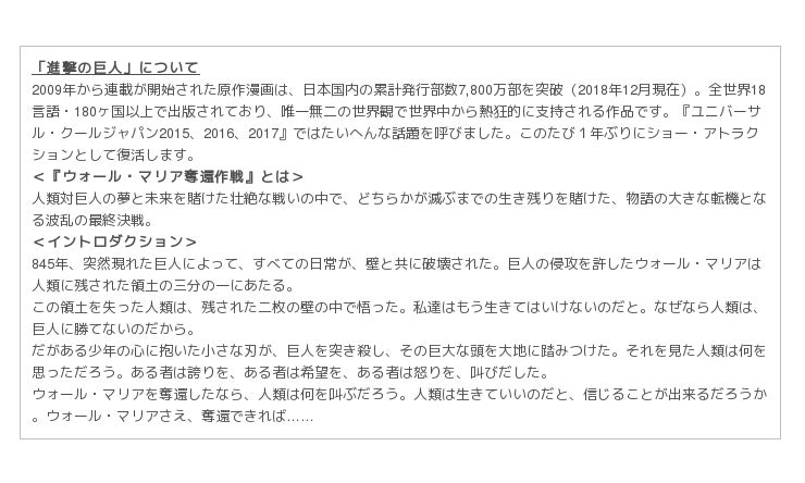 日本国内の累計発行部数7,800万部を突破(2018年12月現在)、全世界18言語・180ヶ国以上で出版され、世界中から熱狂的に支持される『進撃の巨人』(原作:諫山 創)は、ユニバーサル・クールジャパン2015』に登場して以来、作品の世界観がリアルに再現された圧倒的なクオリティで多くのゲストの支持を集めました。1年ぶりの登場となる今年は、大きな話題を呼んでいる4月からのTVアニメ放映「Season3 Part.2」との同時展開となる、『ウォール・マリア奪還作戦』が舞台のショー・アトラクションとしてパークに再び登場します。TVアニメの興奮がよみがえる、TVアニメ視聴とアトラクション体感のシンクロ効果により、今までにない圧倒的な作品への没入体験をお楽しみいただけます。