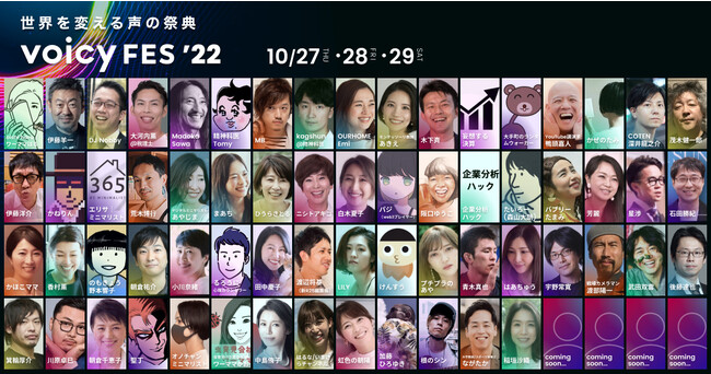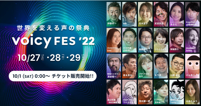 音声プラットフォームVoicyを運営する株式会社Voicyは、声の祭典「Voicy FES ’22」を2022年10月27日(木)から29日(土)の3日にわたって開催します。期間中は、総勢60名を超える声で活躍するパーソナリティらが大集結、声のチカラを体感できるオンラインイベントを創り上げていきます。
